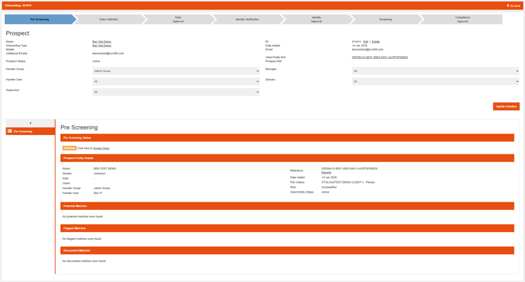 Users can now identify risk earlier in the onboarding journey, before data collection and verification, using the new Pre-Screening stage. This helps reduce operational overhead by preventing unnecessary onboarding activity for high-risk prospects.